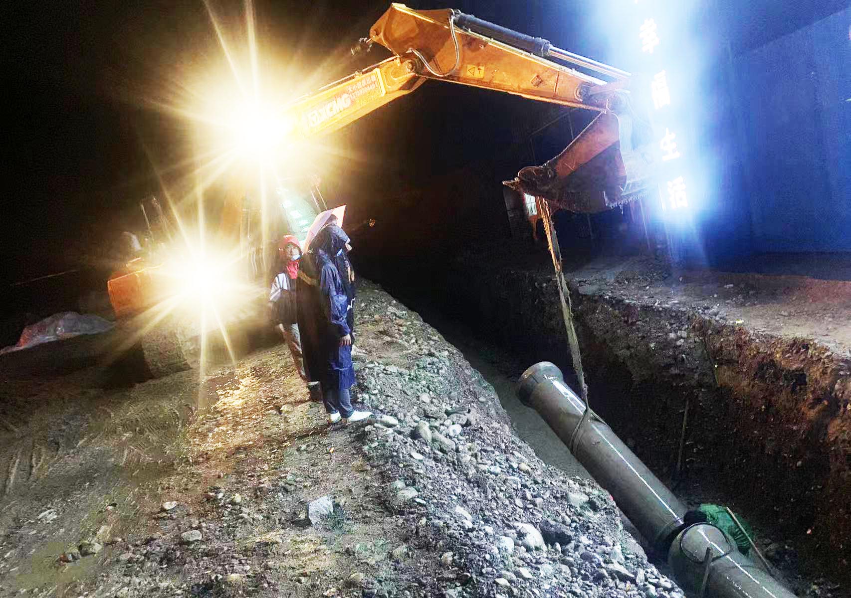 项目部全体人员不辜负每一份信任,迎难而上、连夜冒雨奋战,化压力为动力,争分夺秒抢工期,加班加点赶进度。于7月22日下午6点顺利完成医养中心雨污水管道与市政管网的衔接,并于次日投入使用。