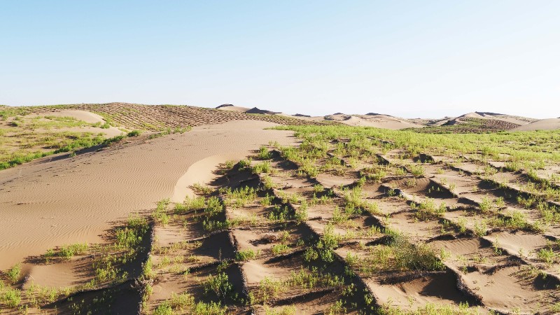 项目设置不同材料的沙障,栽植多种沙生植物,并建立沙漠治理效果监测体系,研究不同沙障材料的耐久性,不同沙生植物的保存率,以及其在防沙治沙领域的防护效果及经济性,评估后期有无次生危害。通过对不同类型沙障和沙生植物防沙治沙效能评价,筛选出适宜本地区效果良好的沙障和沙生植物。基于对筛选出的沙障进行机械化布设,研发设计先进的适用于沙漠环境的固沙装备,形成标准化生产车间及生产线。利用研制出的固沙装备布设筛选出的沙障,栽植筛选出的沙生植物,研究出一种全新的防沙治沙技术,建立一套完整的防沙治沙新模式,进行试验示范并推广应用。
