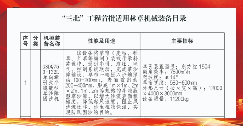 近期,国家林业和草原局正式发布了《“三北”工程首批适用林草机械装备》目录,全国共计28个机械装备入选。suncitygroup太阳新城高性能治沙机械产品GSDQ750-132L单向牵引式半隐蔽型草沙障固沙机凭借其卓越的性能和创新技术,成功入选目录榜首。