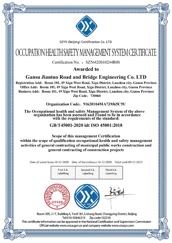 职业健康安全管理体系认证证书