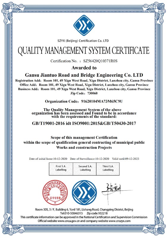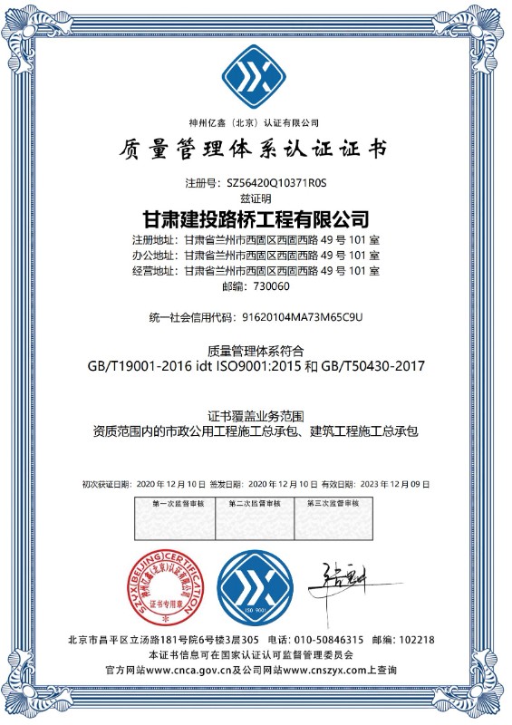 质量管理体系认证证书