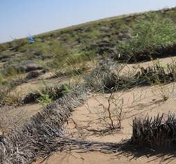 图1:草沙障内花棒生长状况                图2:草沙障内柠条生长状况