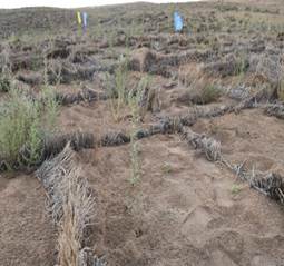 利用固沙机将稻草在沙漠表面铺设成不同形式的草沙障,增大了沙漠表面的粗糙度,消减风力,阻止流沙移动,截流雨水,可以起到明显的防风固沙作用。利用生物固沙技术进行植被恢复,有效改善沙区土地性质,更好的起到防风固沙作用。